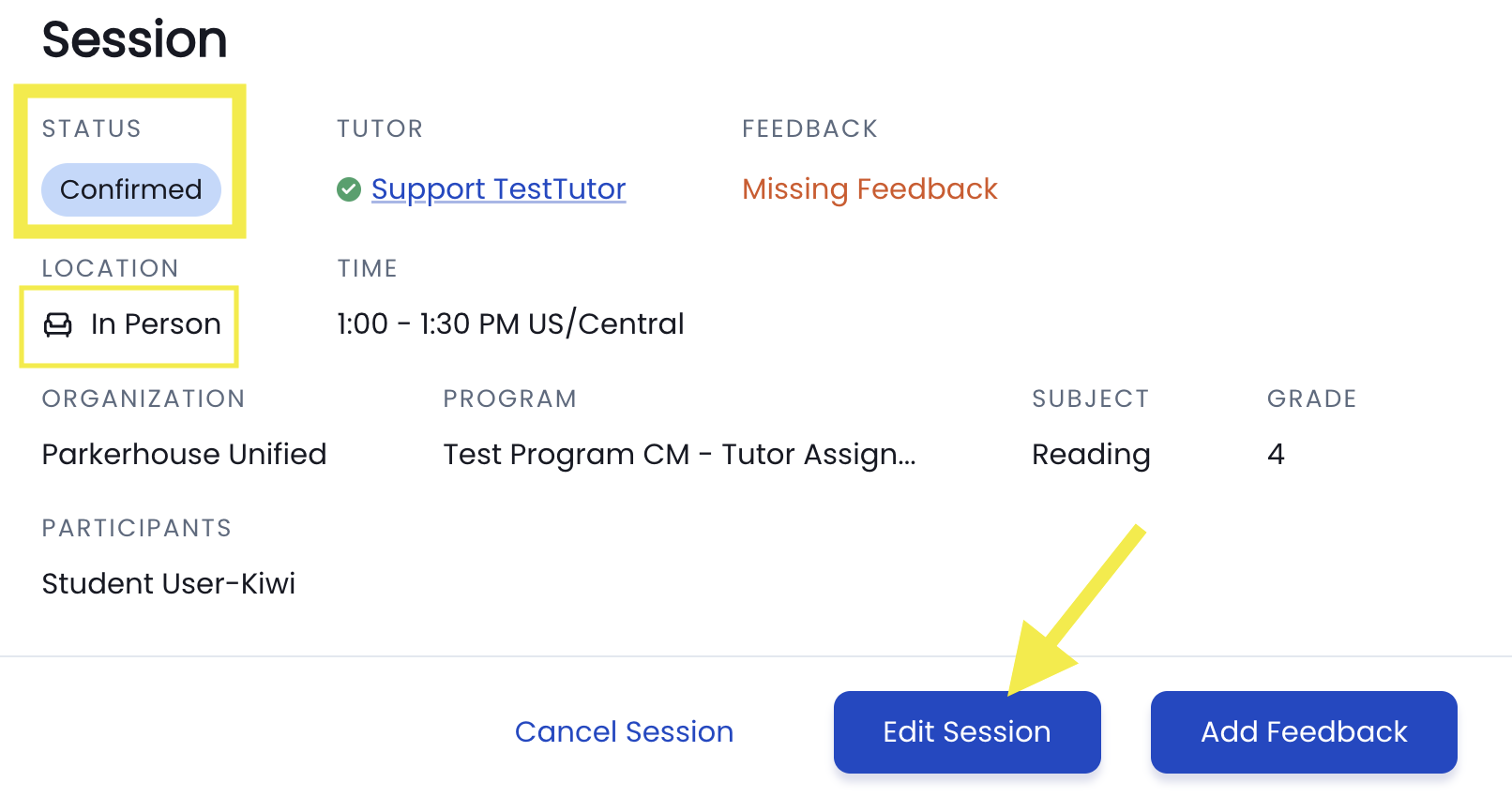 - In Person tutors can find their sessions on their Tutor Dashboard. Confirmed sessions still requiring feedback will appear in the Sessions Missing Feedback area. Tutors can select a session to open the session overview page. Next, click the Edit Session button to begin editing the session as needed. Tutors can also Cancel the session if needed as well, while in Confirmed Status.