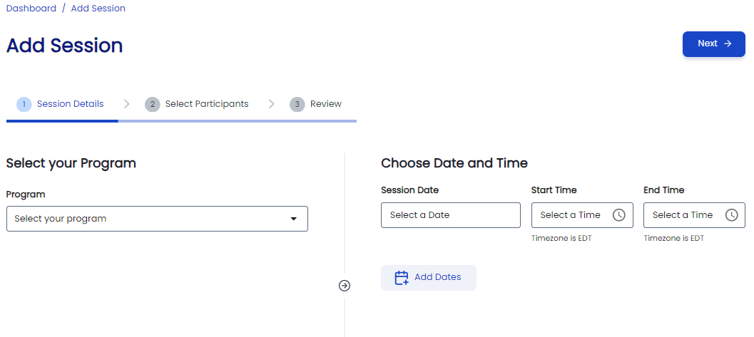 - Click Add Dates to add multiple sessions.