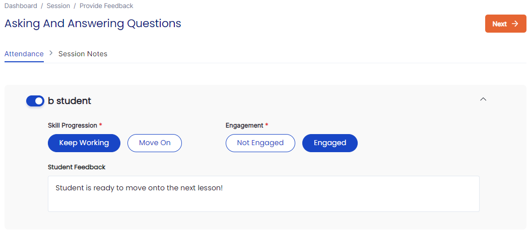 Once the session is created, Tutors can record attendance and feedback for the session after the scheduled end time, or come back later when it’s convenient: